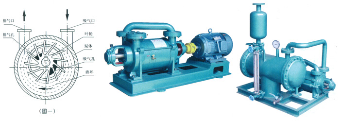 工作原理 2SK系列双级水环式真空泵工作原理: 叶轮偏心地安装在泵体内,(如图一所示),当叶轮按图示方向旋转时,水受离心力的作用向四周甩出,形成了一个与泵腔形状相似的等厚度的封闭的水环,叶轮轮毂与水环知检构成了多个月牙形空间。在图一右侧,相邻两叶片间的月牙形空间不断增大,气体不断被吸入;在图一的左侧,相邻两叶片间的月牙形空间不断缩小,吸入的气体不断被压缩,压力不断增大。当压力大与外界大气压时,气体经排气孔排出,排出的气体经排气管排入大气中。泵在连续运转过程中,不断地进行着吸气、压缩、排气过程,从而达到抽气的目的。