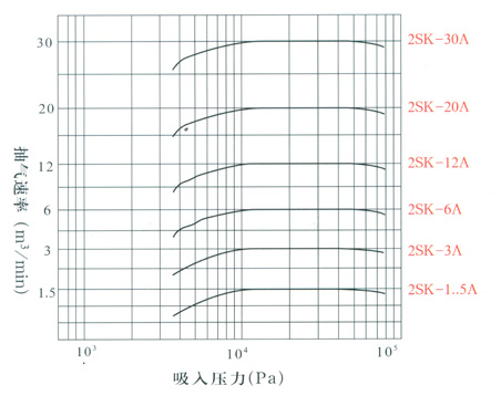本产品复合《JB/T7255-94》 注:表中所列技术参数为下列规定条件下所测量得到: 1、大气压力为0.1013Mpa 2、进水温度为15℃ 3、吸入空气温度为20℃-25℃ 4、空气湿度为70% 5、供水量是极限压力为5×104Pa时的数值 6、抽气速率偏差±10% 应用范围及特点 2SK水环式真空泵,广泛适用于化工机构、石油、轻工、医药、食品等工业行业用来抽吸空气或其它不溶于水、不含固体颗粒、无腐蚀性的气体,以便在密闭容器中形成一定的真空度。常用于真空蒸发、真空浓缩、真空干燥、真空过滤、真空送料等工艺过程。 泵采用特殊材料制造时,允许抽除部分带有少量腐蚀性的气体。 采用防爆电机时,遵守相应的安全规则下,可抽除一般的易燃易爆性气体。本水环泵采用机构密封结构,具有结构紧凑、密封性好、使用可靠、装拆方便,维修简单等特点。 特性曲线