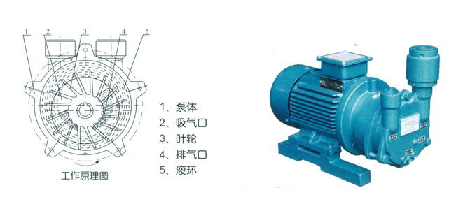 工作原理 叶轮偏心地安装在泵体内(如图)。当叶轮按图示方向旋转时,水受离心力的作用向四周甩出,形成了一个与泵腔形状相似的等厚度的封闭水环,叶轮轮毂与水环之间构成了多个月牙形空间。在图右侧,相邻两叶片间的月牙形空间不断增大,气体通过吸气口,不断吸入气孔;在图左侧,相邻两叶片间的月牙形空间不断缩小,吸入的气体不断被压缩,压力不断增大。当压力大于外界大气压时,气体经排气孔排出,在泵连续运转过程中,不断地进行着吸气、压缩、排气过程,从而达到连续抽气的目的。