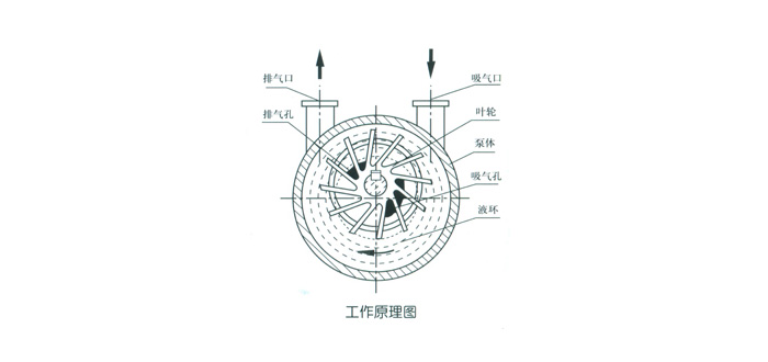 工作原理 叶轮偏心地安装在泵体内,(如图所示),当叶轮按图示方向旋转时,水受离心力的作用向四周甩出,形成了一个与泵体形状相似的等厚度的封闭水环,叶轮轮毂与水环之间构成了多个月牙形空间。在图示右侧,相邻两叶片间的月牙形空间不断增大,气体通过吸气口,不断吸入吸气孔;在图示左侧,相邻两叶片间的月牙空间不断缩小,吸入的气体不断被压缩,压力不断增大,当压力大于外界大气压时,气体经排气孔排出,排出的气体经排气管排入大气。